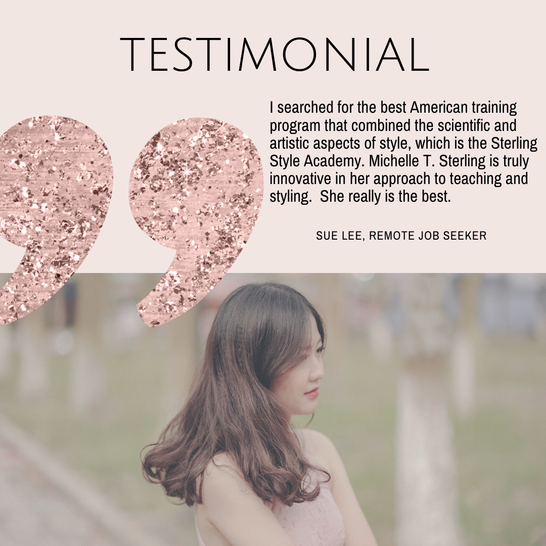 Helen Woo, Chinese-American from Orange County, California, had the same idea and began our Online Image Consultant and Personal Stylist Training Program 5 months ago. She spent the summer working and traveling and has yet to complete the program, however she told the Sterling Style Academy that she loves that she can review the modules are her own pace. She loves learning about the science behind style and implementing these techniques when she works on her assignments and her business brand.