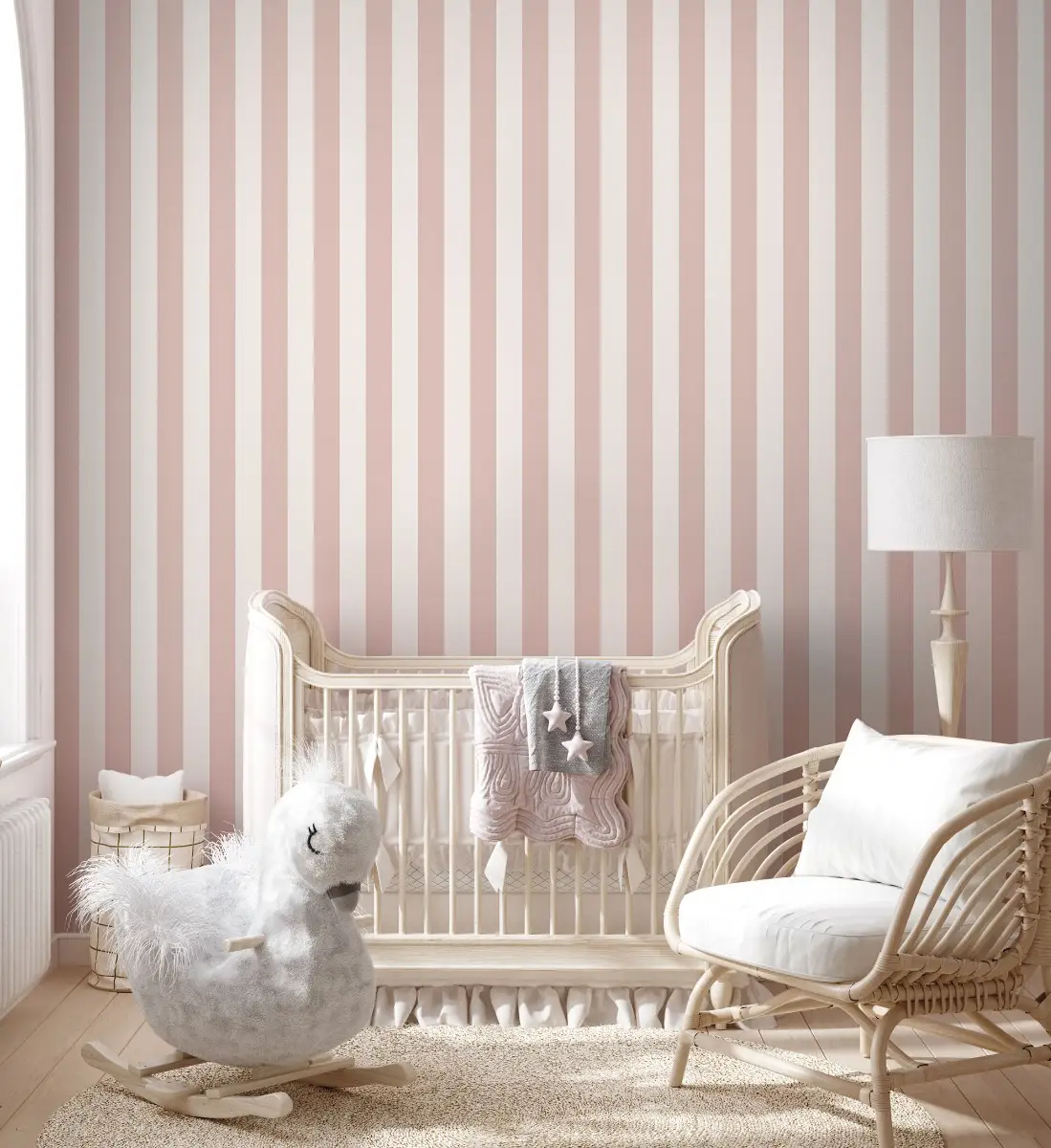 Scandi-style nurseries rely on a calm rhythm. Light textures, soft stripes, tiny repeats, and neutral grounds do the work. This style pairs well with oak, birch, and matte white furniture. It also makes the room feel larger.