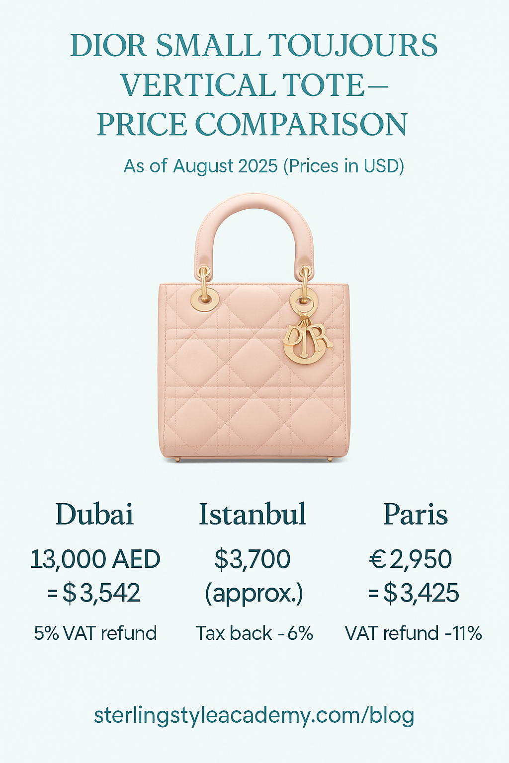 - Dubai: Suppose the equivalent bag is priced at AED 13,000 (roughly €3,240 at an illustrative exchange rate). With a 5% VAT refund (~AED 650), your net is AED 12,350 (about €3,080, subject to exchange rates). While that appears higher than Paris in this snapshot, you’re more likely to find the item in stock—and the process is simpler and quicker.