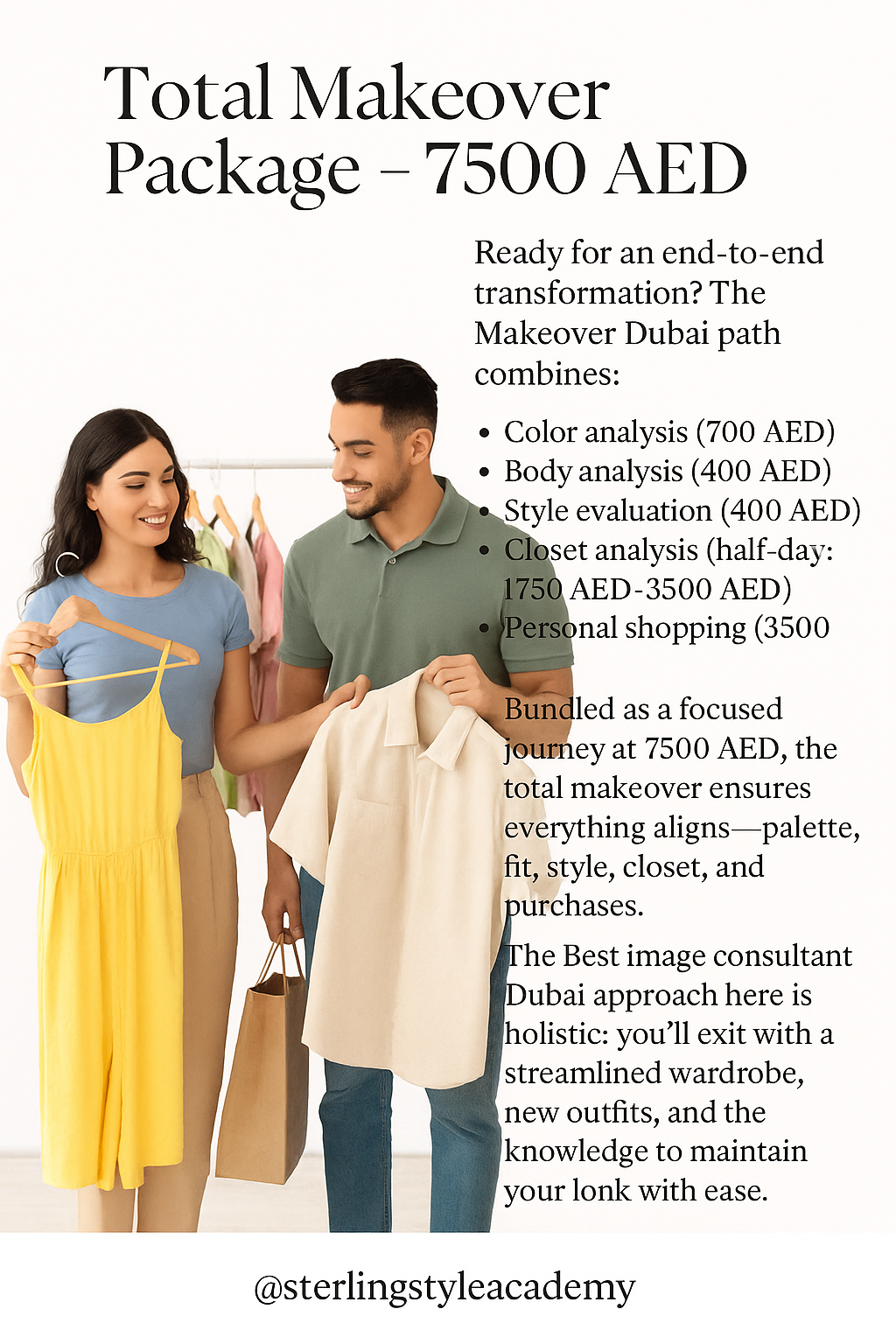 Bundled as a focused journey at 7500 AED, the total makeover ensures everything aligns—palette, fit, style, closet, and purchases. The Best image consultant Dubai approach here is holistic: you’ll exit with a streamlined wardrobe, new outfits, and the knowledge to maintain your look with ease.
